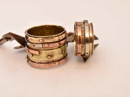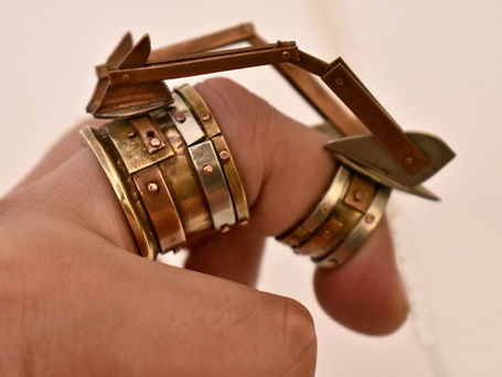 The process by which I give my work color involves a chemical reaction that transforms sheet metal from a dull copper, nugold, or nickel color into sheets of multifarious hues. When Borax (used in some detergents) is placed on sheet metal and heated to just below the melting temperature (the metal glows orange and red) colors emerge. This process is called patination (through an oxidation process) which creates a sheen or gloss. The kinetic joints of the creations are riveted together and the metal is hand formed through hammering/chasing to shape and indent the surface.