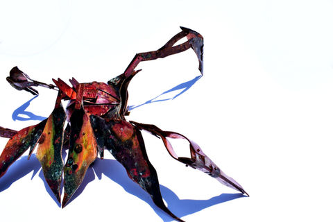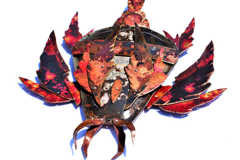 The process by which I give my work color involves a chemical reaction that transforms sheet metal from a dull copper, nugold, or nickel color into sheets of multifarious hues. When Borax (used in some detergents) is placed on sheet metal and heated to just below the melting temperature (the metal glows orange and red) colors emerge. This process is called patination (through an oxidation process) which creates a sheen or gloss. The kinetic joints of the creations are riveted together and the metal is hand formed through hammering/chasing to shape and indent the surface.